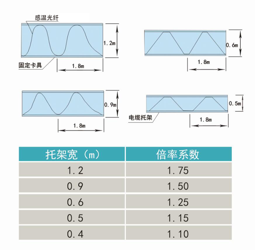 ★以正弦波接觸式敷設的感溫光纖的長度按下列公式确定:感溫光纖的長度=托架長度X倍率系數(shù),其中倍率系數(shù)按表1确定。
